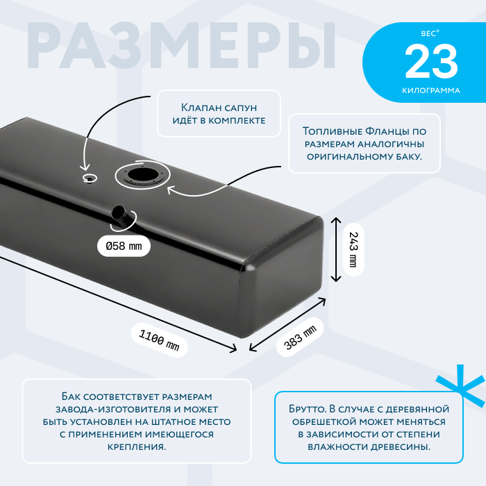- Так же, если вы приобретаете алюминиевый топливный бак, он будет в деревянной обрешетке (для усиления защиты при транспортировке). При просчете веса и объема, цена за доставку может измениться по факту взвешивания на самом терминале транспортной компании. Так как деревянная обрешетка соответственно изготовлена из древесины, и она имеет свойство значительно набирать вес в зависимости от влажности окружающей среды.
