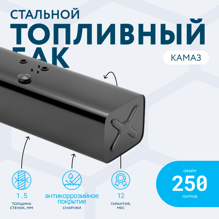 Бак изготовлен из стали увеличенной толщины 1,5 мм. Снаружи бак окрашен полимерно-порошковой краской финского производства. Топливный бак надежно упакован в плотный картон и фирменную пленку. Имеет паспорт и декларацию таможенного союза, Гарантия - 1 год.
