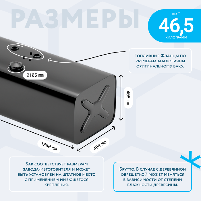 Устанавливается при помощи имеющихся кронштейнов без доработок. Все технологические отверстия соответствуют оригинальному баку, с которого можно переставить датчик уровня топлива и топливозаборник. Новые датчик и заборник Вы можете приобрести отдельно. Горловина, внутри которой установлена сетка, предотвращающая попадание постороннего мусора в бак через крышку, соответствует оригинальной по диаметру, наклону, вылету и расположению. Стальная полуоборотная заглушка производства БАКОР без замка, а также сливная пробка (1/4" коническая, под шестигранник) включены в стоимость бака без комплектующих.