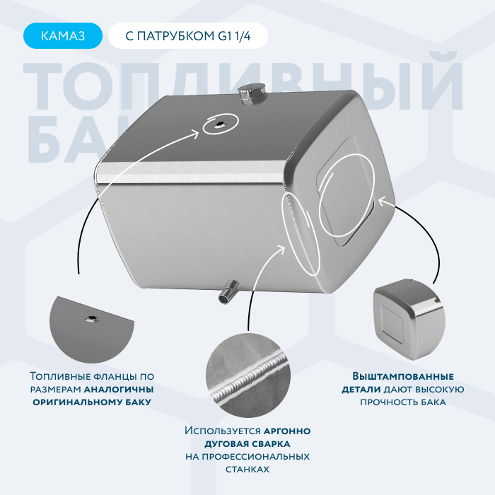Алюминиевый бак не подвержен коррозии, что делает его более долговечным, а так же сбережет вашу топливную систему. Бак из алюминия в два раза легче стального бака, хотя он и изготовлен из листа увеличенной толщины в 2,5 мм. В конструкции предусмотрены цельные перегородки, которые проварены по периметру. Баки из алюминия так же оснащены заливной горловиной с самозапираемым непроливаемым клапаном (который становится барьером для разлива топлива, а так же становится защитой от попадания мусора в бак при открытой крышке) . Кроме того, однозначно что алюминиевый бак выглядит намного привлекательнее и дороже - где бак в том числе становиться и элементом тюнинга автомобиля. На алюминиеввые баки действует увеличенная гарантия - 36 месяцев.