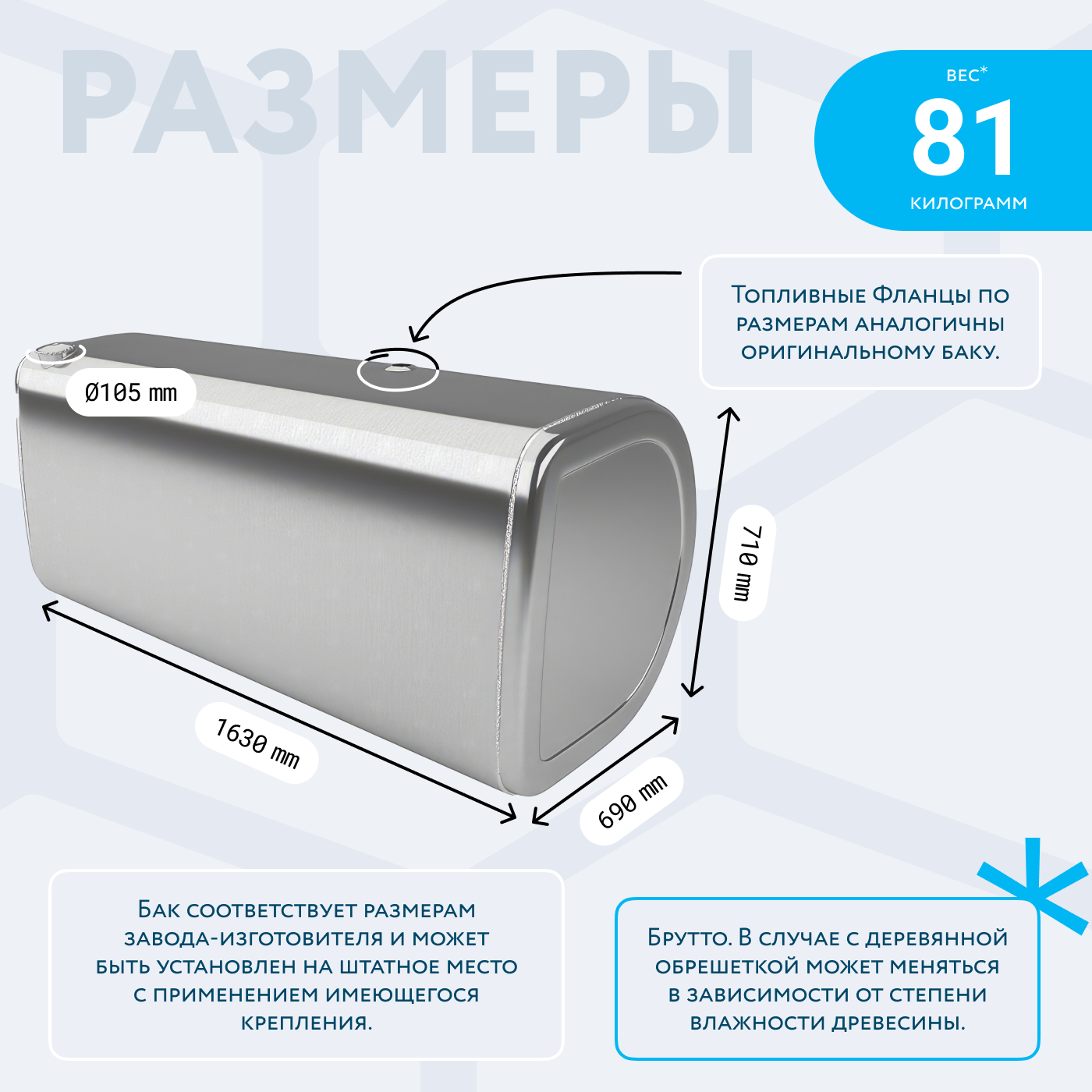 - Так же, если вы приобретаете алюминиевый топливный бак, он будет в деревянной обрешетке (для усиления защиты при транспортировке). При просчете веса и объема, цена за доставку может измениться по факту взвешивания на самом терминале транспортной компании. Так как деревянная обрешетка соответственно изготовлена из древесины, и она имеет свойство значительно набирать вес в зависимости от влажности окружающей среды.
