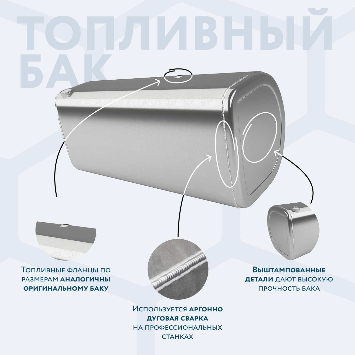 Алюминиевый бак не подвержен коррозии, что делает его более долговечным, а так же сбережет вашу топливную систему. Бак из алюминия в два раза легче стального бака, хотя он и изготовлен из листа увеличенной толщины в 2,5 мм. В конструкции предусмотрены цельные перегородки, которые проварены по периметру. Баки из алюминия так же оснащены заливной горловиной с самозапираемым непроливаемым клапаном (который становится барьером для разлива топлива, а так же становится защитой от попадания мусора в бак при открытой крышке) . Кроме того, однозначно что алюминиевый бак выглядит намного привлекательнее и дороже - где бак в том числе становиться и элементом тюнинга автомобиля. На алюминиеввые баки действует увеличенная гарантия - 36 месяцев.