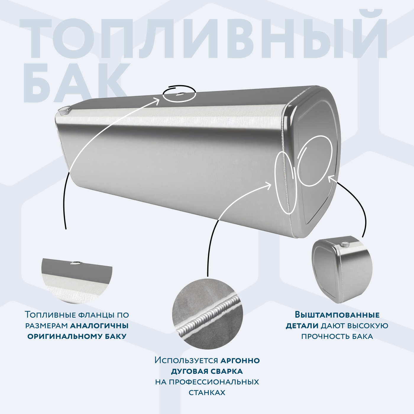 Алюминиевый бак не подвержен коррозии, что делает его более долговечным, а так же сбережет вашу топливную систему. Бак из алюминия в два раза легче стального бака, хотя он и изготовлен из листа увеличенной толщины в 2,5 мм. В конструкции предусмотрены цельные перегородки, которые проварены по периметру. Баки из алюминия так же оснащены заливной горловиной с самозапираемым непроливаемым клапаном (который становится барьером для разлива топлива, а так же становится защитой от попадания мусора в бак при открытой крышке) . Кроме того, однозначно что алюминиевый бак выглядит намного привлекательнее и дороже - где бак в том числе становиться и элементом тюнинга автомобиля. На алюминиеввые баки действует увеличенная гарантия - 36 месяцев.