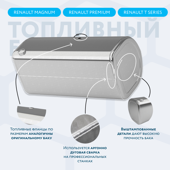Алюминиевый бак не подвержен коррозии, что делает его более долговечным, а так же сбережет вашу топливную систему. Бак из алюминия в два раза легче стального бака, хотя он и изготовлен из листа увеличенной толщины в 2,5 мм. В конструкции предусмотрены цельные перегородки, которые проварены по периметру. Баки из алюминия так же оснащены заливной горловиной с самозапираемым непроливаемым клапаном (который становится барьером для разлива топлива, а так же становится защитой от попадания мусора в бак при открытой крышке) . Кроме того, однозначно что алюминиевый бак выглядит намного привлекательнее и дороже - где бак в том числе становиться и элементом тюнинга автомобиля. На алюминиеввые баки действует увеличенная гарантия - 36 месяцев.